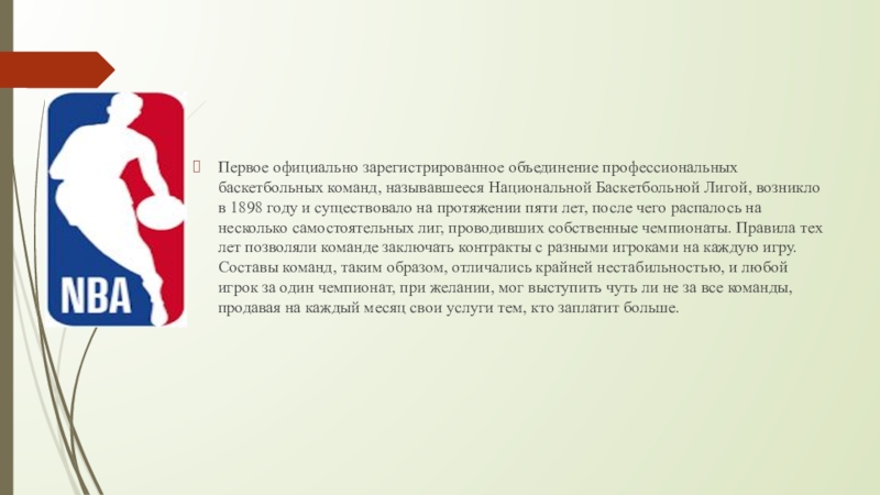 Слайд 6 По примеру Национальной Баскетбольной Лиги, впервые объединившей в 1898 году