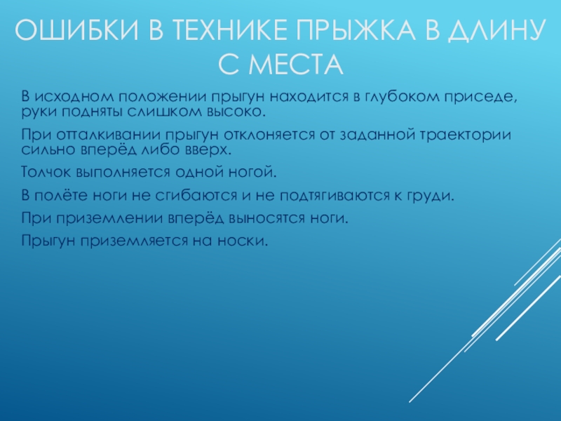 При отталкивании прыгун отклоняется от заданной траектории сильно вперёд либо вверх.