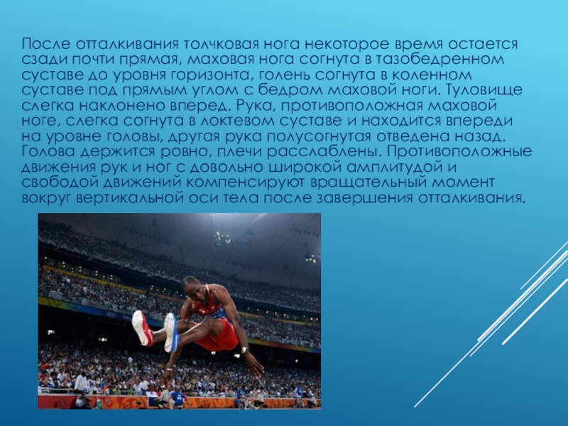 Слайд 9После отталкивания толчковая нога некоторое время остается сзади почти прямая, маховая