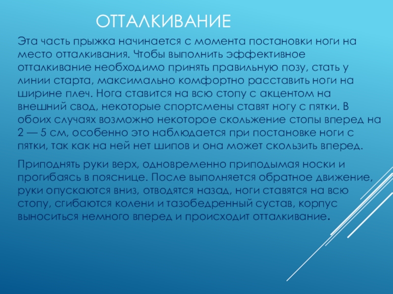 Эта заключительная часть прыжка имеет большое значение для его дальности. Подготовка