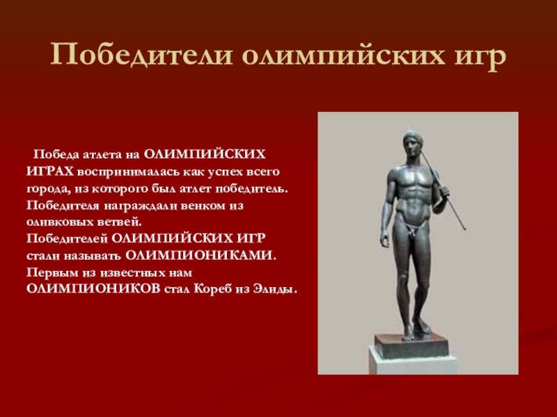 воспринималась как успех всего города, из которого был атлет победитель. Победителя награждали венком из оливковых ветвей. Победителей ОЛИМПИЙСКИХ ИГР стали называть ОЛИМПИОНИКАМИ. Первым из известных нам ОЛИМПИОНИКОВ стал Кореб из Элиды.