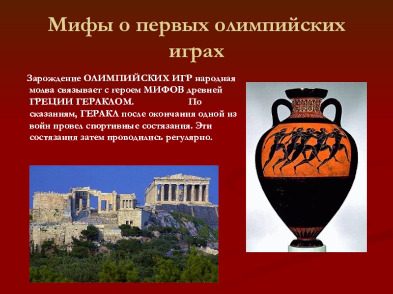 Мифы о первых олимпийских играх Зарождение ОЛИМПИЙСКИХ ИГР народная молва связывает с героем МИФОВ древней ГРЕЦИИ ГЕРАКЛОМ. По сказаниям, ГЕРАКЛ после окончания одной из