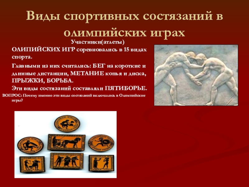 Главными из них считались: БЕГ на короткие и длинные дистанции, МЕТАНИЕ копья и диска, ПРЫЖКИ, БОРЬБА. Эти виды состязаний составляли ПЯТИБОРЬЕ.