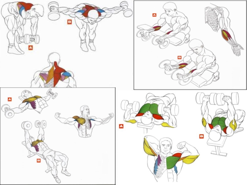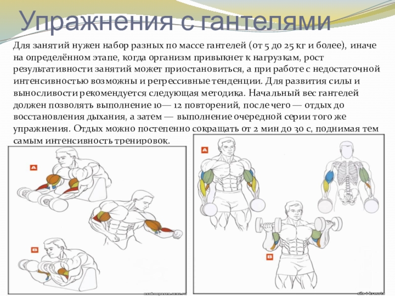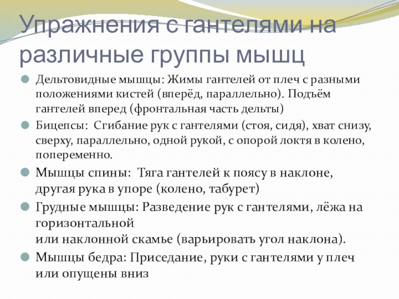 Слайд 12Упражнения с гантелями на различные группы мышц