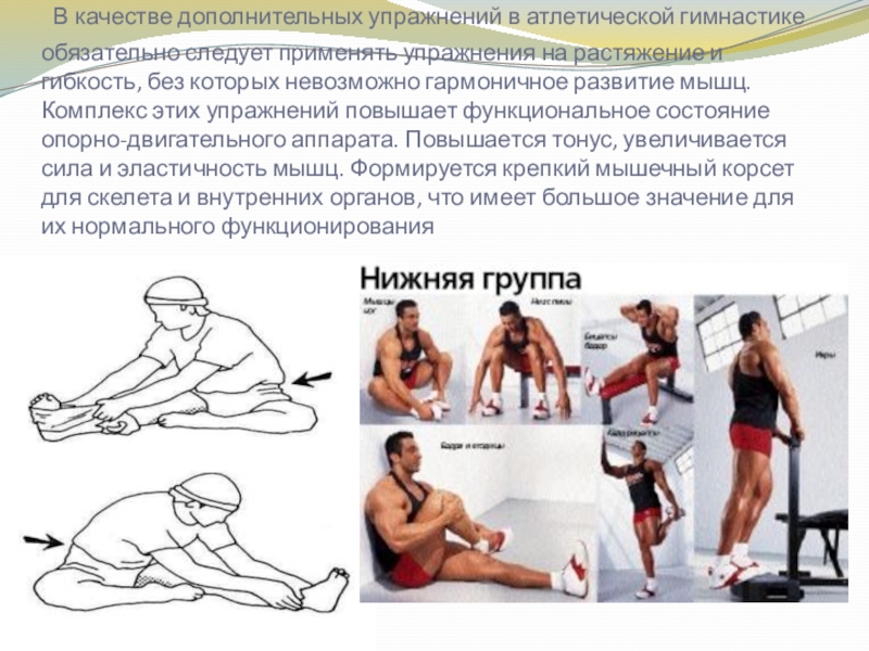 Слайд 14 В качестве дополнительных упражнений в атлетической гимнастике обязательно следует применять упражнения