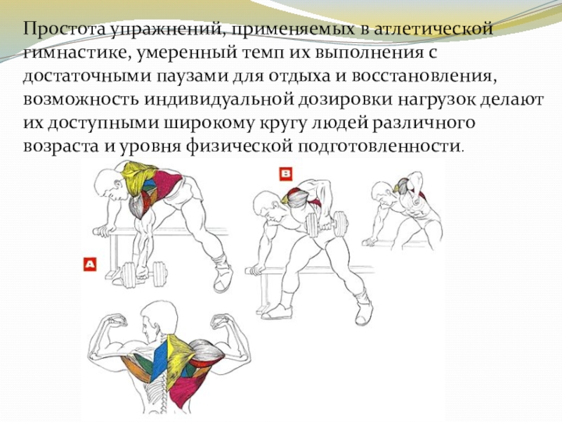 Слайд 10Простота упражнений, применяемых в атлетической гимнастике, умеренный темп их выполнения с