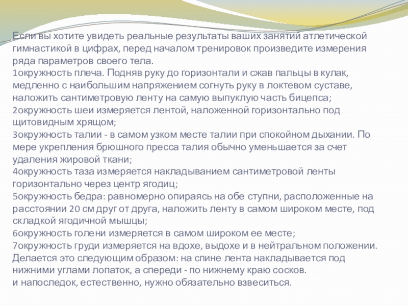 цифрах, перед началом тренировок произведите измерения ряда параметров своего тела.