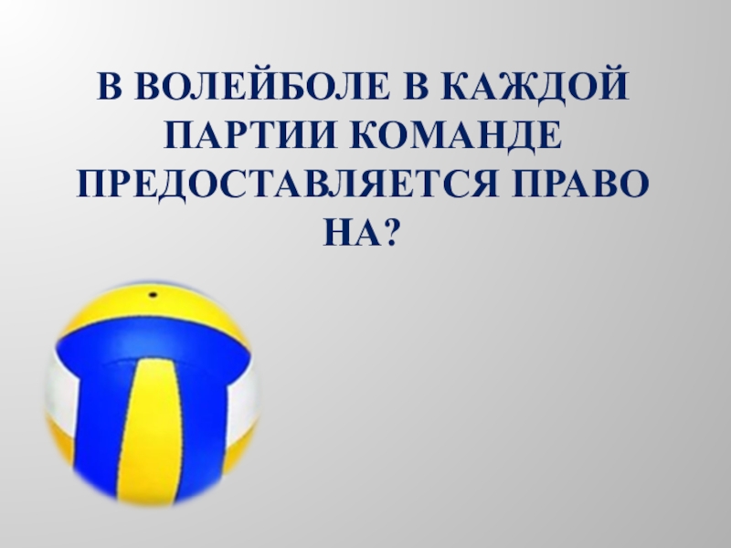 Слайд 14В волейболе в каждой партии команде предоставляется право на?
