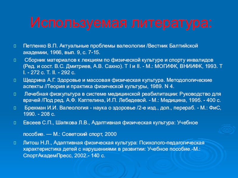Петленко В.П. Актуальные проблемы валеологии /Вестник Балтийской академии, 1966, вып.