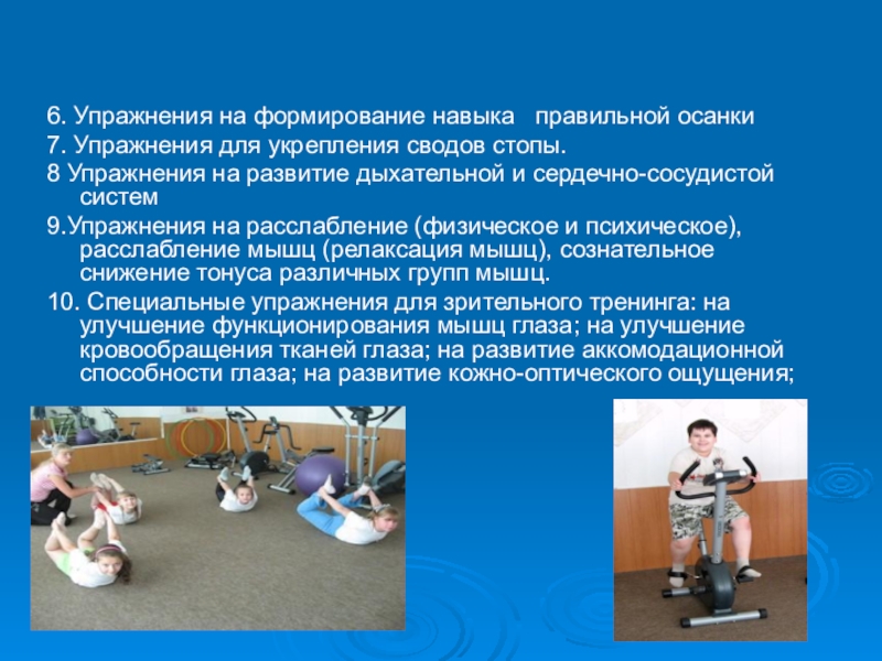 10. Специальные упражнения для зрительного тренинга: на улучшение функционирования мышц глаза; на улучшение кровообращения тканей глаза; на развитие аккомодационной способности глаза; на развитие кожно-оптического ощущения;