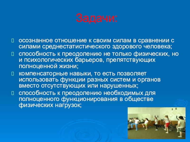 1. Максимально возможное развитие жизнеспособности человека, имеющего устойчивые отклонения в состоянии здоровья, за счет обеспечения оптимального режима функционирования отпущенных природой и имеющихся в наличии его телесно-двигательных характеристик и духовных сил, их гармонизации для максимальной самореализации в качестве социально и индивидуально значимого субъекта.