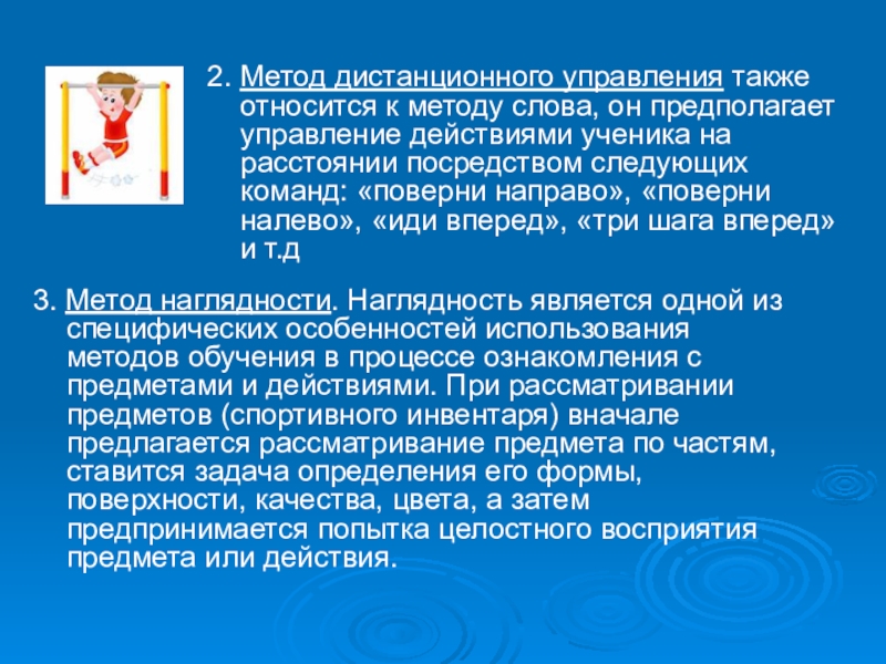 2. Метод дистанционного управления также относится к методу слова, он предполагает управление действиями ученика на расстоянии посредством следующих команд: «поверни направо», «поверни налево», «иди вперед», «три шага вперед» и т.д