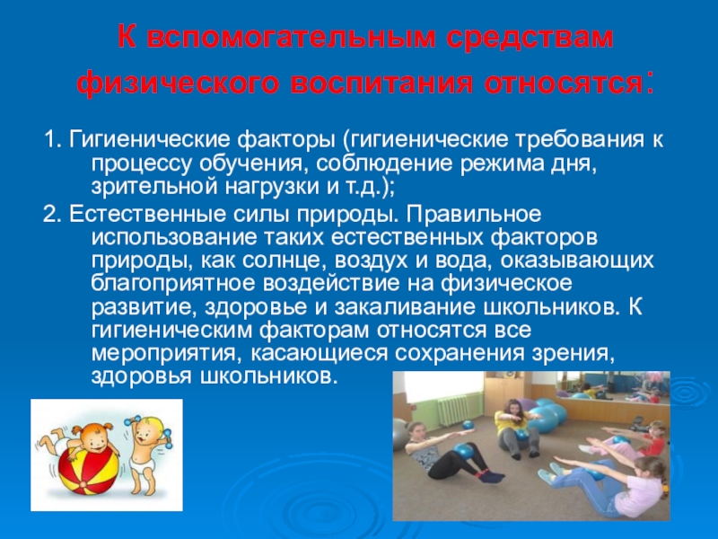 2. Естественные силы природы. Правильное использование таких естественных факторов природы, как солнце, воздух и вода, оказывающих благоприятное воздействие на физическое развитие, здоровье и закаливание школьников. К гигиеническим факторам относятся все мероприятия, касающиеся сохранения зрения, здоровья школьников.