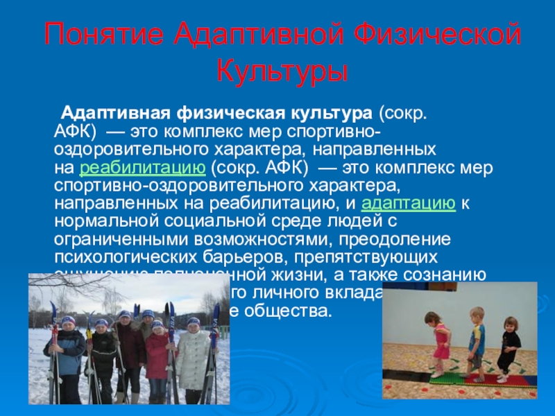 комплекс мер спортивно-оздоровительного характера, направленных на реабилитацию (сокр. АФК) — это комплекс мер спортивно-оздоровительного характера, направленных на реабилитацию, и адаптацию к нормальной социальной среде людей с ограниченными возможностями, преодоление психологических барьеров, препятствующих ощущению полноценной жизни, а также сознанию необходимости своего личного вклада в социальное развитие общества.
