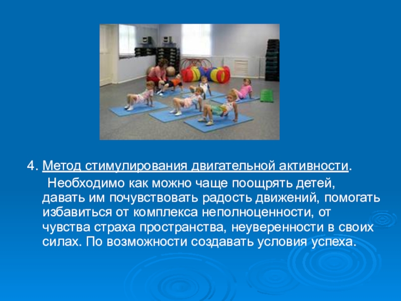 им почувствовать радость движений, помогать избавиться от комплекса неполноценности, от чувства страха пространства, неуверенности в своих силах. По возможности создавать условия успеха.