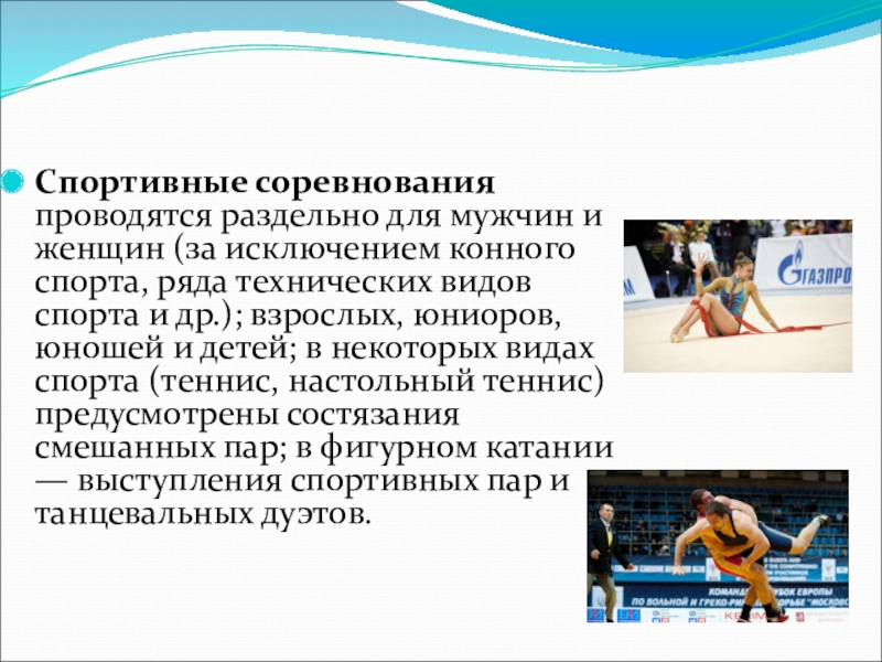 спорта, ряда технических видов спорта и др.); взрослых, юниоров, юношей и детей; в некоторых видах спорта (теннис, настольный теннис) предусмотрены состязания смешанных пар; в фигурном катании — выступления спортивных пар и танцевальных дуэтов.