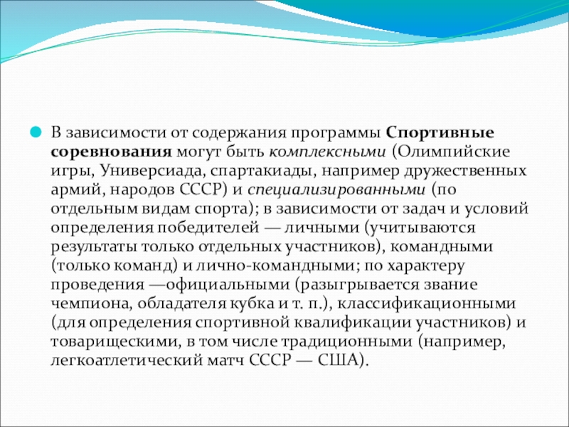 В зависимости от содержания программы Спортивные соревнования могут быть комплексными (Олимпийские