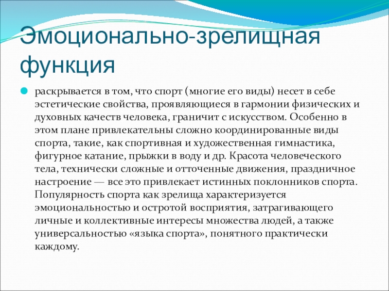 себе эстетические свойства, проявляющиеся в гармонии физических и духовных качеств человека, граничит с искусством. Особенно в этом плане привлекательны сложно координированные виды спорта, такие, как спортивная и художественная гимнастика, фигурное катание, прыжки в воду и др. Красота человеческого тела, технически сложные и отточенные движения, праздничное настроение — все это привлекает истинных поклонников спорта. Популярность спорта как зрелища характеризуется эмоциональностью и остротой восприятия, затрагивающего личные и коллективные интересы множества людей, а также универсальностью «языка спорта», понятного практически каждому.