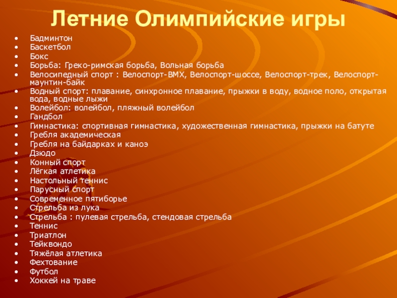 спорт : Велоспорт-BMX, Велоспорт-шоссе, Велоспорт-трек, Велоспорт-маунтин-байк