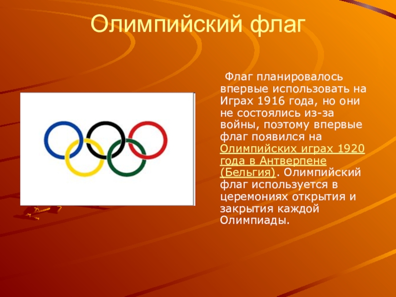 не состоялись из-за войны, поэтому впервые флаг появился на Олимпийских играх 1920 года в Антверпене (Бельгия). Олимпийский флаг используется в церемониях открытия и закрытия каждой Олимпиады.