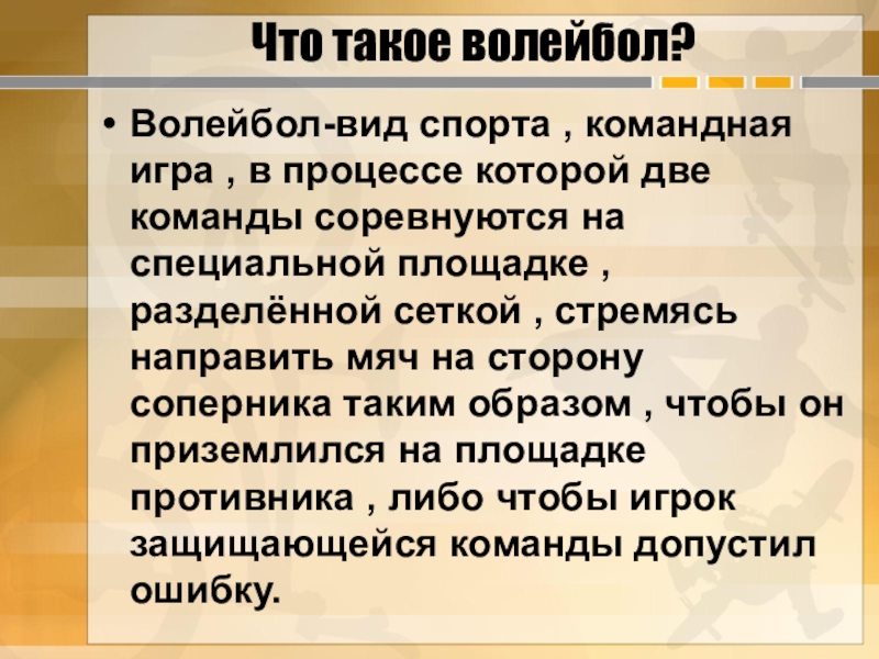Что такое волейбол?Волейбол-вид спорта , командная игра , в процессе которой две команды соревнуются на специальной площадке