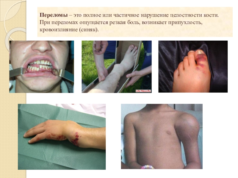 Слайд 16Переломы – это полное или частичное нарушение целостности кости. При переломах