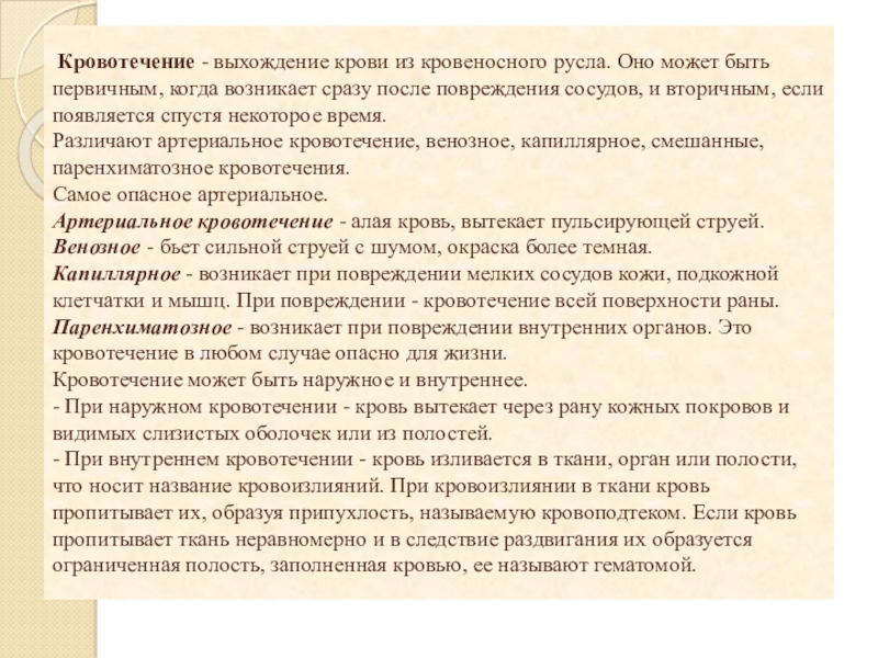 Слайд 9 Кровотечение - выхождение крови из кровеносного русла. Оно может быть первичным,