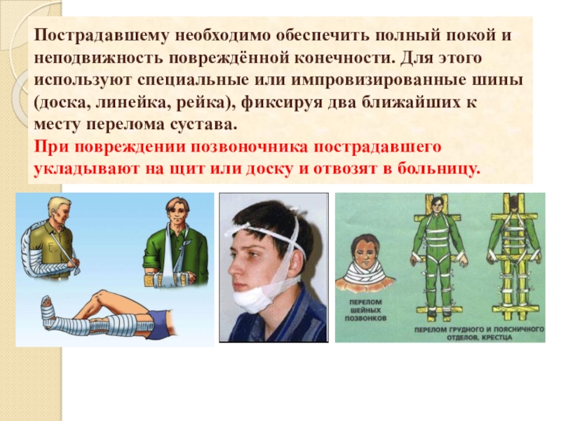 Слайд 17Пострадавшему необходимо обеспечить полный покой и неподвижность повреждённой конечности. Для этого