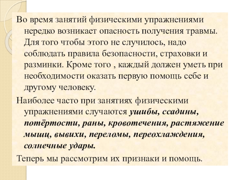Слайд 2Во время занятий физическими упражнениями нередко возникает опасность получения травмы. Для