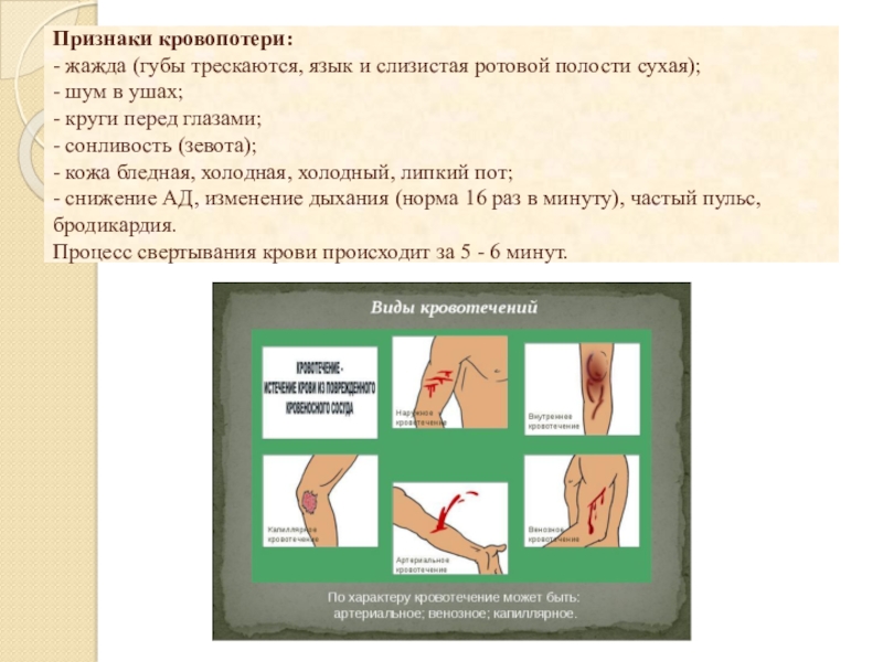 Различают артериальное кровотечение, венозное, капиллярное, смешанные, паренхиматозное кровотечения.