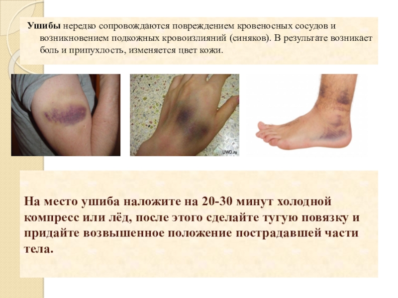 Ушибы нередко сопровождаются повреждением кровеносных сосудов и возникновением подкожных кровоизлияний (синяков). В результате возникает боль и припухлость, изменяется цвет кожи.