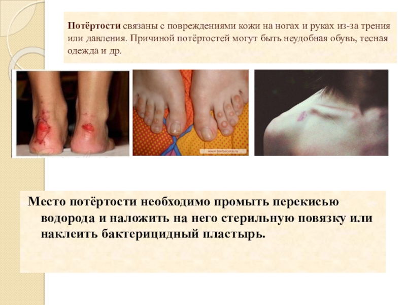 Слайд 5Потёртости связаны с повреждениями кожи на ногах и руках из-за трения