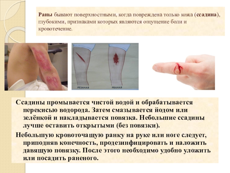 Слайд 7Раны бывают поверхностными, когда повреждена только кожа (ссадина), глубокими, признаками которых