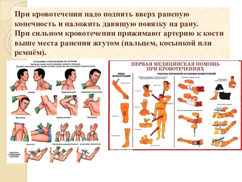 Слайд 11При кровотечении надо поднять вверх раненую конечность и наложить давящую повязку