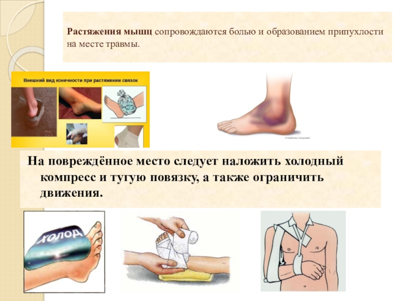 Слайд 13Растяжения мышц сопровождаются болью и образованием припухлости на месте травмы.