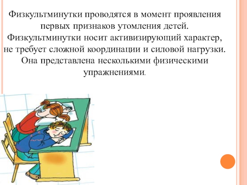 Слайд 4Физкультминутки проводятся в момент проявления первых признаков утомления детей. Физкультминутки носит