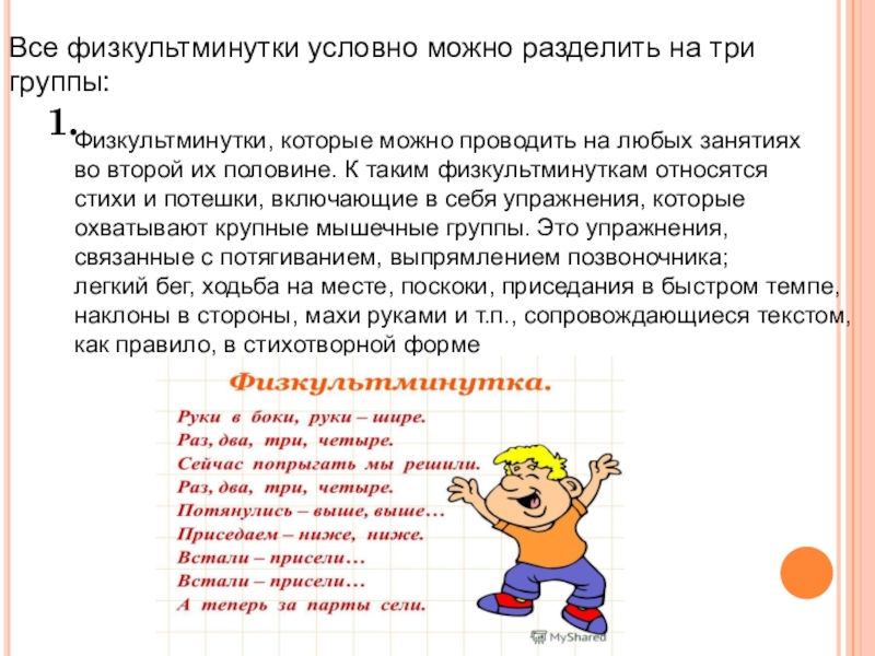 Слайд 6Все физкультминутки условно можно разделить на три