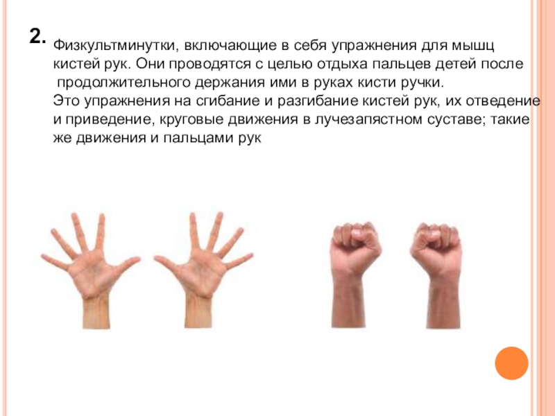 Это упражнения на сгибание и разгибание кистей рук, их отведение