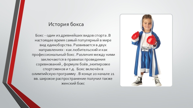 самый популярный в мире вид единоборства. Развивается в двух направлениях : как любительский и как профессиональный бокс. Различия между ними заключаются в правилах проведения соревнований , формуле боёв ,экипировке спортсменов и т.д. Бокс включён в олимпийскую программу . В конце 20 начале 21 вв. широкое распространение получил также женский бокс