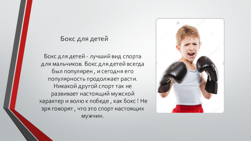 Бокс для детей всегда был популярен , и сегодня его популярность продолжает расти. Никакой другой спорт так не развивает настоящий мужской характер и волю к победе , как бокс ! Не зря говорят , что это спорт настоящих мужчин.