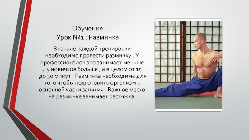 профессионалов это занимает меньше , у новичков больше , а в целом от 15 до 30 минут . Разминка необходима для того чтобы подготовить организм к основной части занятия . Важное место на разминке занимает растяжка.