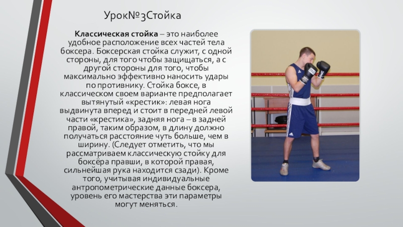 Классическая стойка – это наиболее удобное расположение всех частей тела боксера. Боксерская
