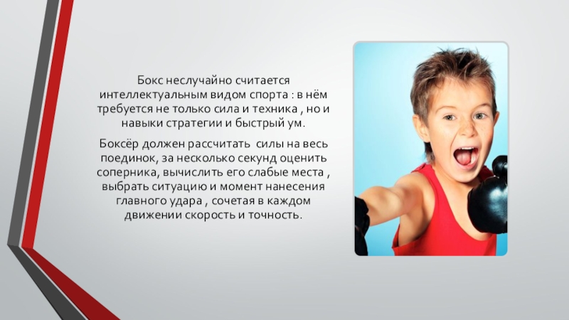 Слайд 4Бокс неслучайно считается интеллектуальным видом спорта : в нём требуется не