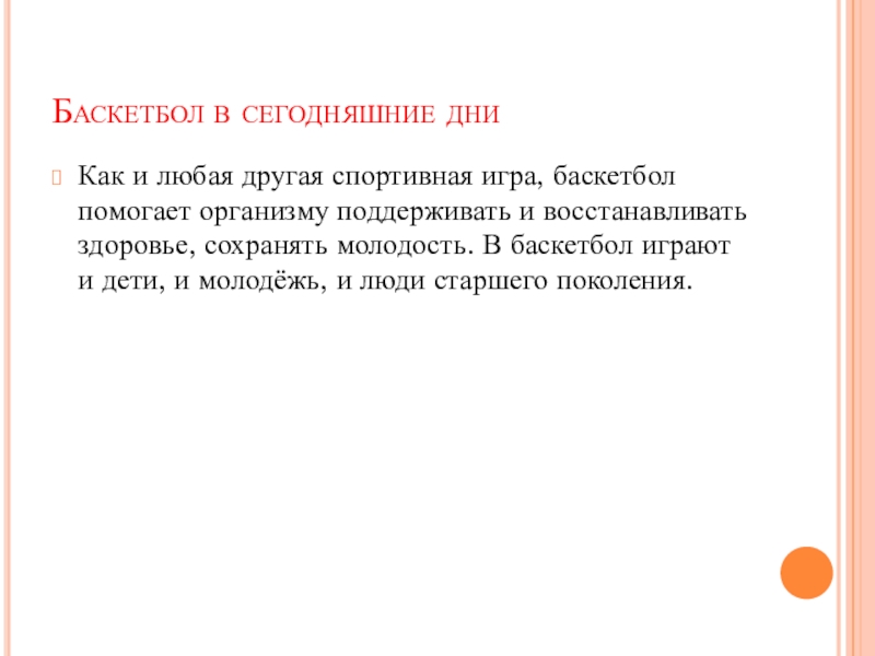 организму поддерживать и восстанавливать здоровье, сохранять молодость. В баскетбол играют и дети, и молодёжь, и люди старшего поколения.
