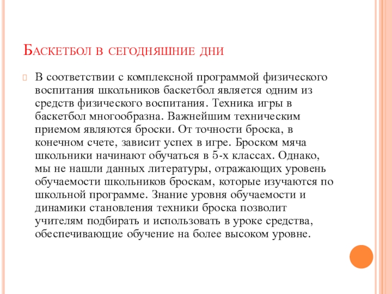баскетбол является одним из средств физического воспитания. Техника игры в баскетбол многообразна. Важнейшим техническим приемом являются броски. От точности броска, в конечном счете, зависит успех в игре. Броском мяча школьники начинают обучаться в 5-х классах. Однако, мы не нашли данных литературы, отражающих уровень обучаемости школьников броскам, которые изучаются по школьной программе. Знание уровня обучаемости и динамики становления техники броска позволит учителям подбирать и использовать в уроке средства, обеспечивающие обучение на более высоком уровне.