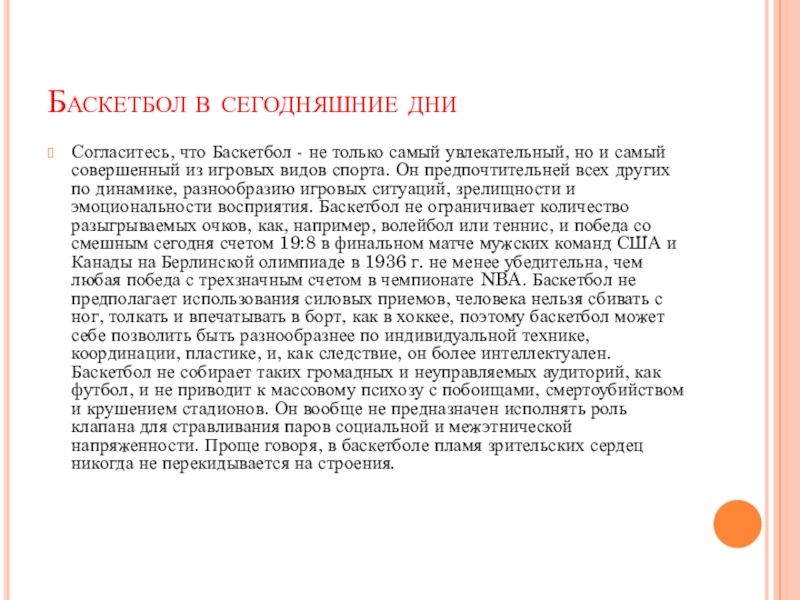 но и самый совершенный из игровых видов спорта. Он предпочтительней всех других по динамике, разнообразию игровых ситуаций, зрелищности и эмоциональности восприятия. Баскетбол не ограничивает количество разыгрываемых очков, как, например, волейбол или теннис, и победа со смешным сегодня счетом 19:8 в финальном матче мужских команд США и Канады на Берлинской олимпиаде в 1936 г. не менее убедительна, чем любая победа с трехзначным счетом в чемпионате NBA. Баскетбол не предполагает использования силовых приемов, человека нельзя сбивать с ног, толкать и впечатывать в борт, как в хоккее, поэтому баскетбол может себе позволить быть разнообразнее по индивидуальной технике, координации, пластике, и, как следствие, он более интеллектуален. Баскетбол не собирает таких громадных и неуправляемых аудиторий, как футбол, и не приводит к массовому психозу с побоищами, смертоубийством и крушением стадионов. Он вообще не предназначен исполнять роль клапана для стравливания паров социальной и межэтнической напряженности. Проще говоря, в баскетболе пламя зрительских сердец никогда не перекидывается на строения.