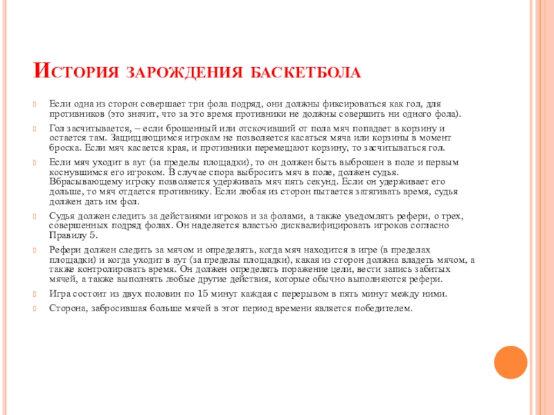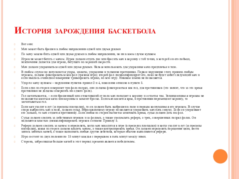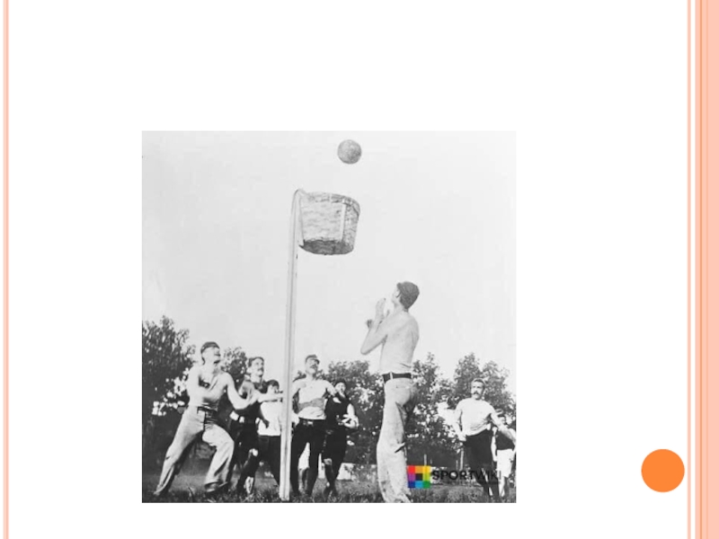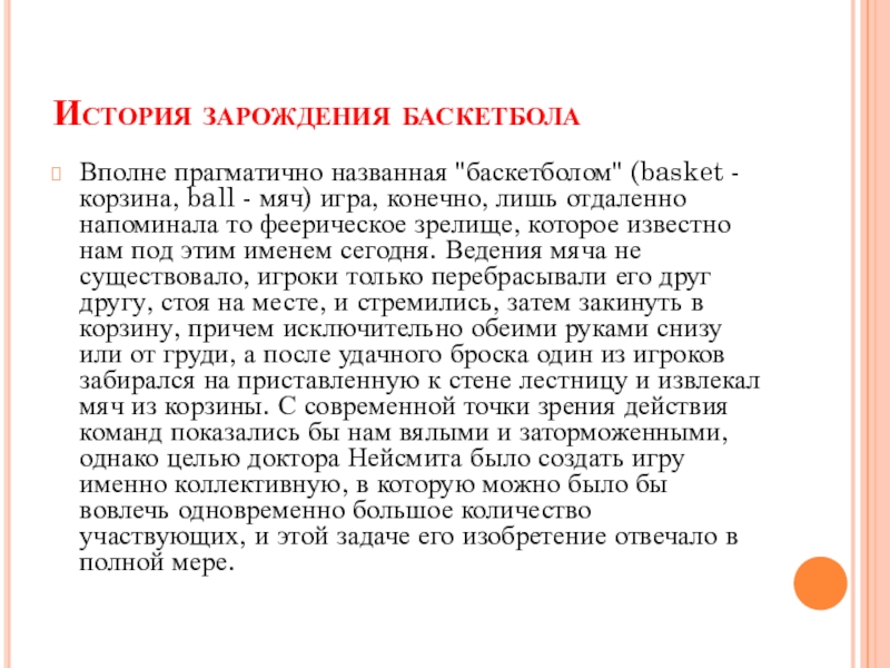 мяч) игра, конечно, лишь отдаленно напоминала то феерическое зрелище, которое известно нам под этим именем сегодня. Ведения мяча не существовало, игроки только перебрасывали его друг другу, стоя на месте, и стремились, затем закинуть в корзину, причем исключительно обеими руками снизу или от груди, а после удачного броска один из игроков забирался на приставленную к стене лестницу и извлекал мяч из корзины. С современной точки зрения действия команд показались бы нам вялыми и заторможенными, однако целью доктора Нейсмита было создать игру именно коллективную, в которую можно было бы вовлечь одновременно большое количество участвующих, и этой задаче его изобретение отвечало в полной мере.