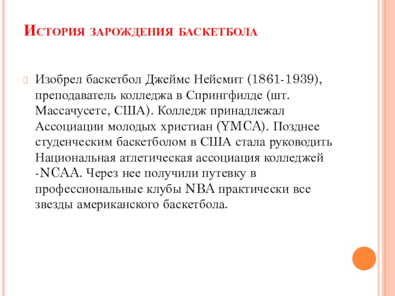 (шт. Массачусетс, США). Колледж принадлежал Ассоциации молодых христиан (YMCA). Позднее студенческим баскетболом в США стала руководить Национальная атлетическая ассоциация колледжей -NCAA. Через нее получили путевку в профессиональные клубы NBA практически все звезды американского баскетбола.