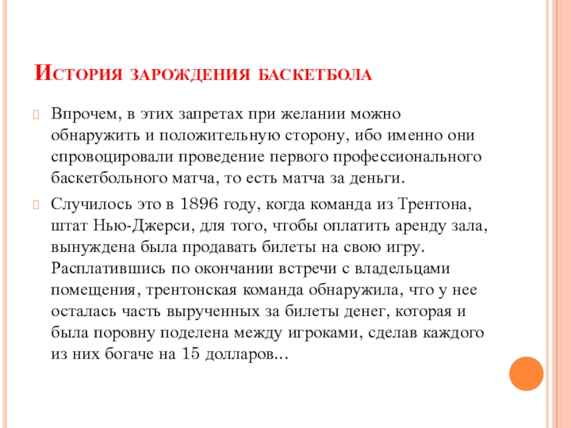 Случилось это в 1896 году, когда команда из Трентона, штат Нью-Джерси, для того, чтобы оплатить аренду зала, вынуждена была продавать билеты на свою игру. Расплатившись по окончании встречи с владельцами помещения, трентонская команда обнаружила, что у нее осталась часть вырученных за билеты денег, которая и была поровну поделена между игроками, сделав каждого из них богаче на 15 долларов...