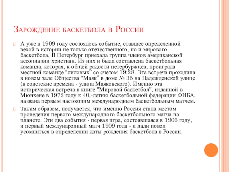 определенной вехой в истории не только отечественного, но и мирового баскетбола, В Петербург приехала группа членов американской ассоциации христиан. Из них и была составлена баскетбольная команда, которая, к общей радости петербуржцев, проиграла местной команде "лиловых” со счетом 19:28. Эта встреча проходила в новом зале Общества "Маяк” в доме № 35 на Надежденской улице (в советские времена - улица Маяковского). Именно эта историческая встреча в книге "Мировой баскетбол”, изданной в Мюнхене в 1972 году к 40,-летию баскетбольной федерации ФИБА, названа первым настоящим международным баскетбольным матчем.